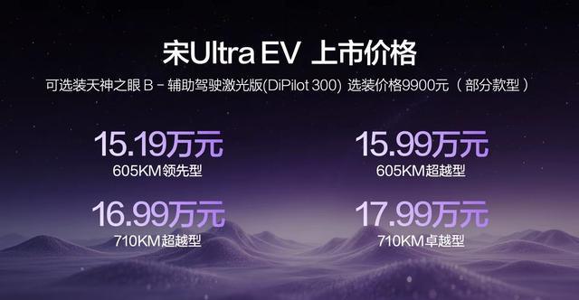本次比亚迪宋Ultra EV一共推出了4款车型,分别是:605KM领先型、605KM超越型、710KM超越型、710KM卓越型;满足了对预算不足和有超远续航客户的需求,新车全系搭载比亚迪第二代刀片电池及闪充技术,同时拥有710公里超远CLTC纯电续航,再加上天神之眼B、云辇-C、TBC高速爆胎稳行系统等豪华配置,为消费者带来全新的纯电出行方式,颠覆技术打造越级体验,全面开启闪充时代!